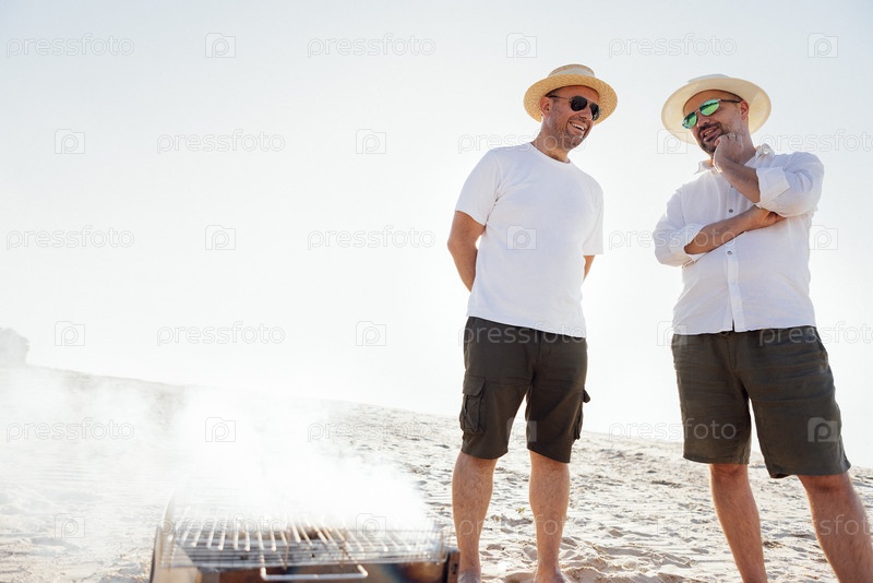 Два молодых человека в обычной летней одежде стоят возле барбекю у моря, друзья смеются и жарят мясо на песчаном пляже