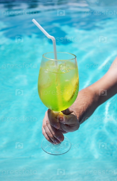 Вкусный зеленый коктейль в стакане, мужчина держит чашку холодного летнего напитка с кусочком лимона среди голубой воды