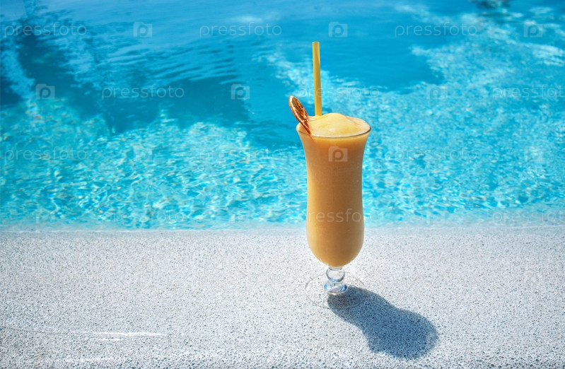 Вкусный молочный коктейль в элегантном стакане на берегу бассейна, чашка прохладного летнего напитка с соломой и кусочком апельсина среди голубой воды