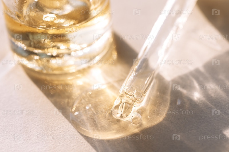 Близкая стеклянная пипетка с прозрачным гелем с пузырями и коллоидным золотом. Косметические изделия. Бутылка с каплей увлажняющей сыворотки или эссенции на фактурном фоне