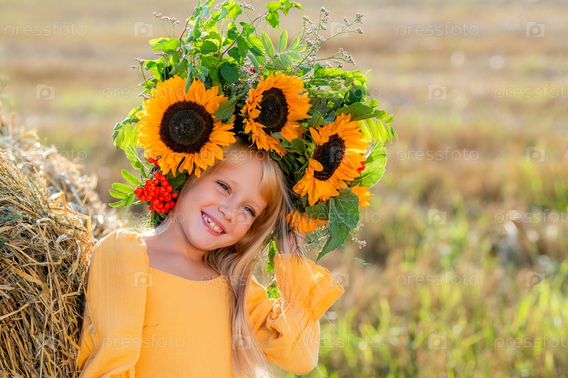 Молодая девушка в яркой подсолнечной короне и желтом платье, опирающаяся на сток сена на солнечном поле