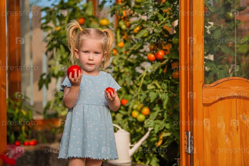 Маленькая девочка в голубом платье стоит у теплицы, держа свежевыбранные помидоры.Солнечный свет подчеркивает ее счастливое выражение лица и яркие цвета сада