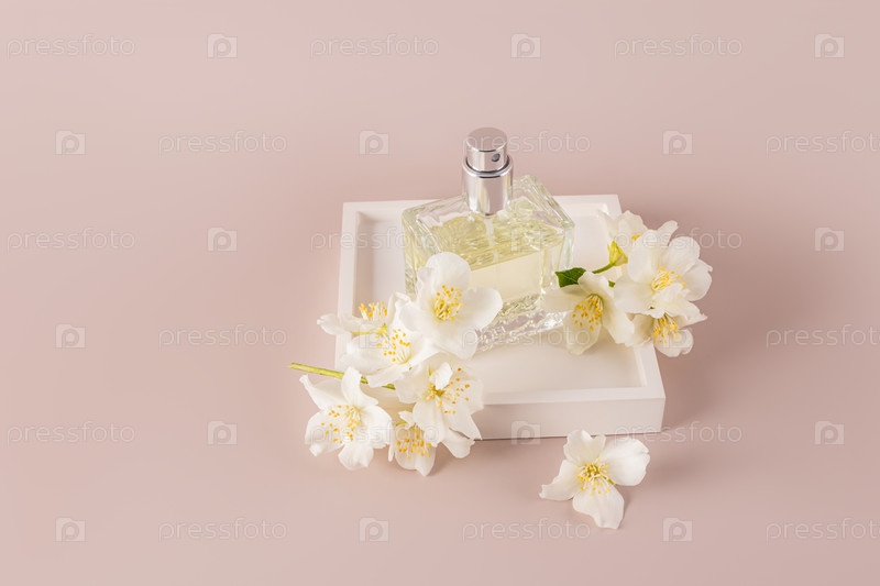 Прозрачная бутылка женского парфюма с ароматом нежных цветов жасмина на квадратной подносе среди цветков жасмина