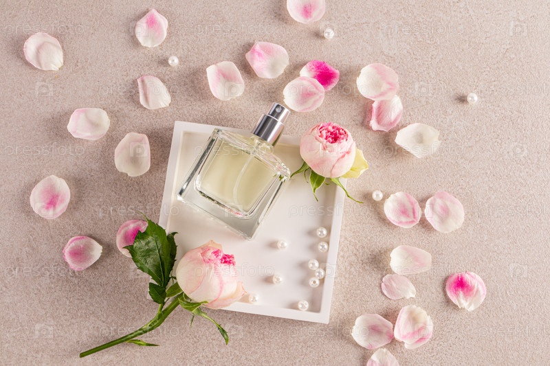 Красивая прозрачная бутылка косметики, спрея и парфюмерии лежит на квадратном белом подносе среди розовых маленьких роз, листьев