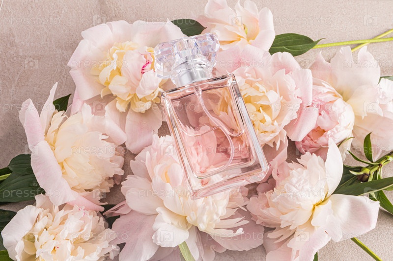Бутылка женского парфюма без марки на фоне красивых розовых пион. Плавающий вид сверху. Пустая бутылочная компоновка