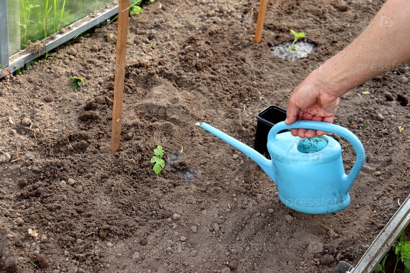 Рука фермера поливает капустные побеги, посаженные в теплице из небольшого арбуза