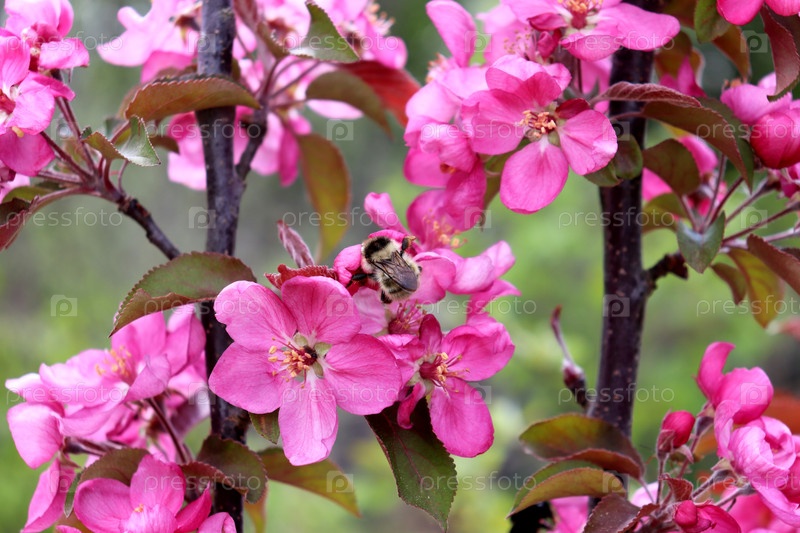 Белый шмель опыляет розовый цветок на яблоне китайского сорта Red Meat в пасмурный весенний день