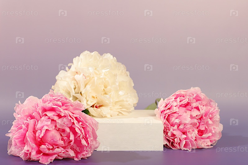 Пустая трибуна с красивыми цветками пиони. Абстрактная цветковая композиция, баннер. Творческий шаблон для вашего дизайна. Минимальная современная эстетика, элегантная концепция красоты