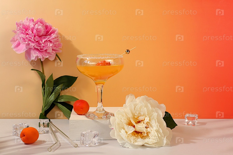 Современный натюрморт с летним алкогольным коктейлем и пионками на современном солнечном фоне, минималистическая концепция бар-кафе, рекламный баннер