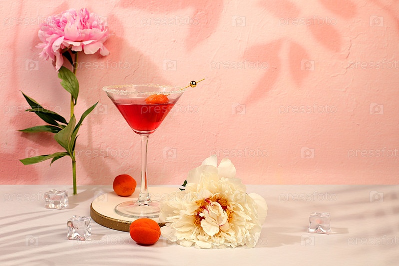 Минимальная концепция летней вечеринки, рекламный баннер для бара, кафе.Современная натюрморт с розовым мартини, летний алкогольный коктейль с абрикосом для партий и пионы на элегантном современном фоне,