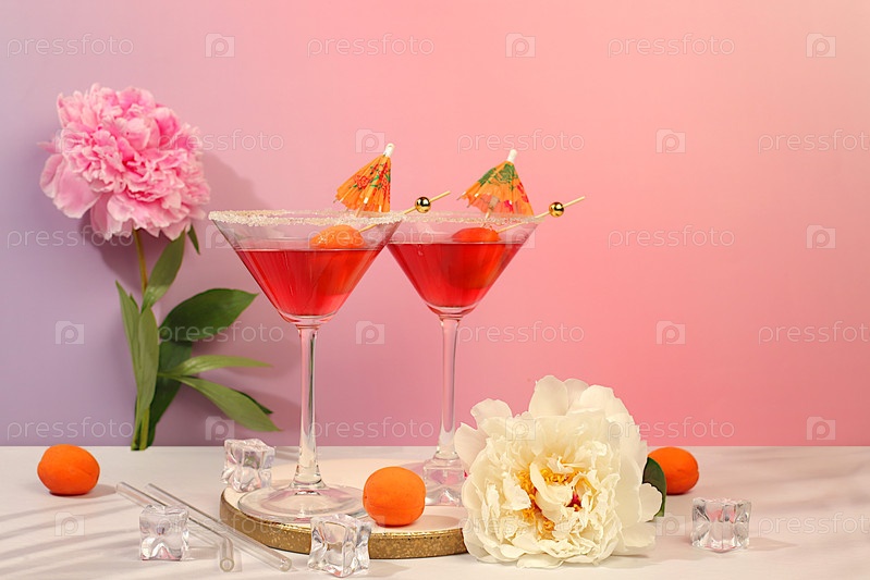 Минимальная концепция летней вечеринки, рекламный баннер для бара, кафе.Современная натюрморт с розовым мартини, летний алкогольный коктейль с абрикосом для партий и пионы на элегантном современном фоне,