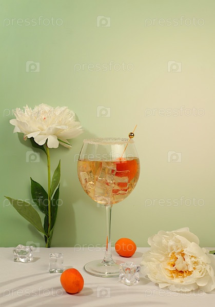 Минимальный натюрморт с цветами и алкоголем, королевский лимонадный коктейль с текилой, джином, ромом, льдом и свежими абрикосовыми ягодами, бар и концептуальная вечеринка с пиониками, рекламные карточки ресторана и кафе