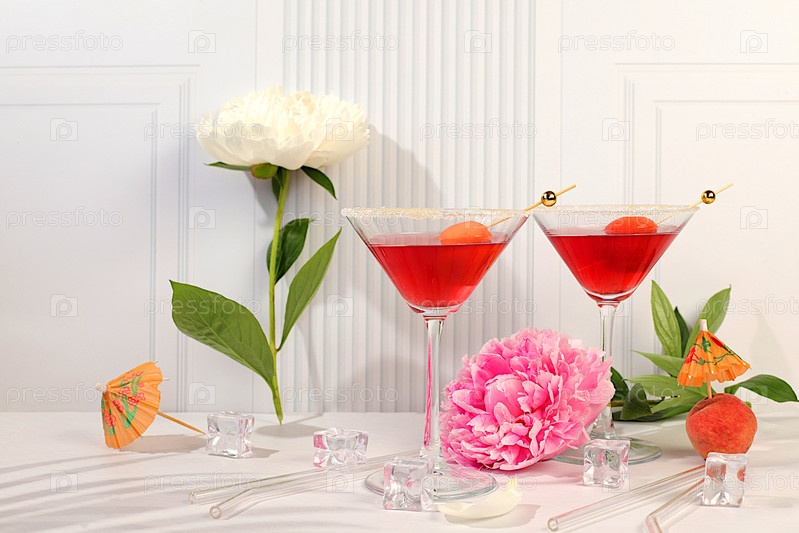 Современный натюрморт с розовым мартини, летний алкогольный коктейль с абрикосом для вечеринок и пионы на элегантном современном фоне, минималистическая концепция бара, кафе, рекламного баннера