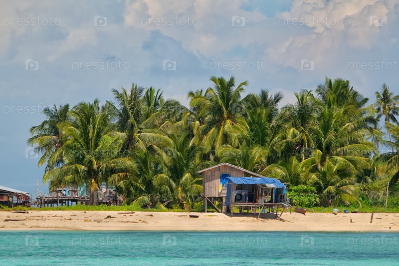 Вид на берег рифового острова с кокосовыми пальмами и хижинами морской цыганской деревни недалеко от города Семпорна на острове Борнео