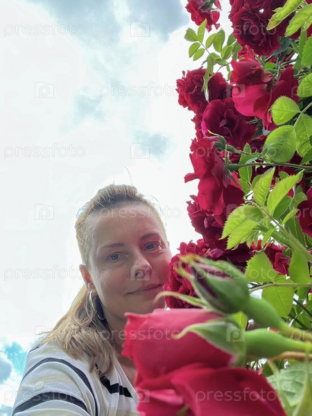 Летом 50-летняя женщина позирует в своем саду с розами на заднем плане