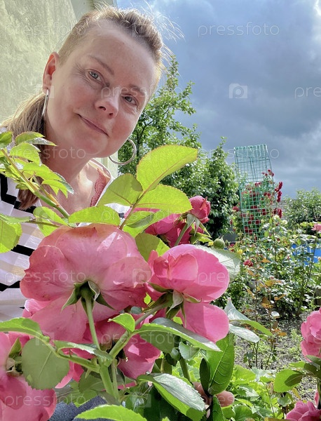 Летом 50-летняя женщина позирует в своем саду с розами на заднем плане