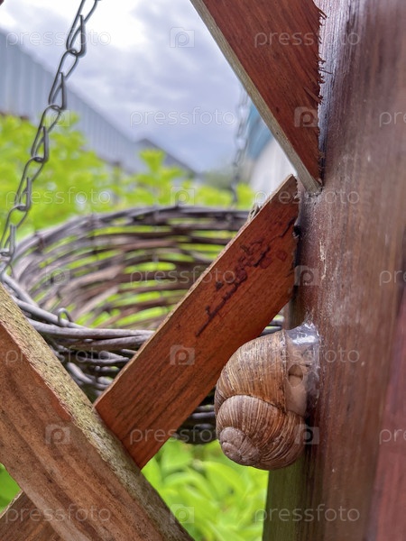 Виноградная улитка в летнем саду на беседке