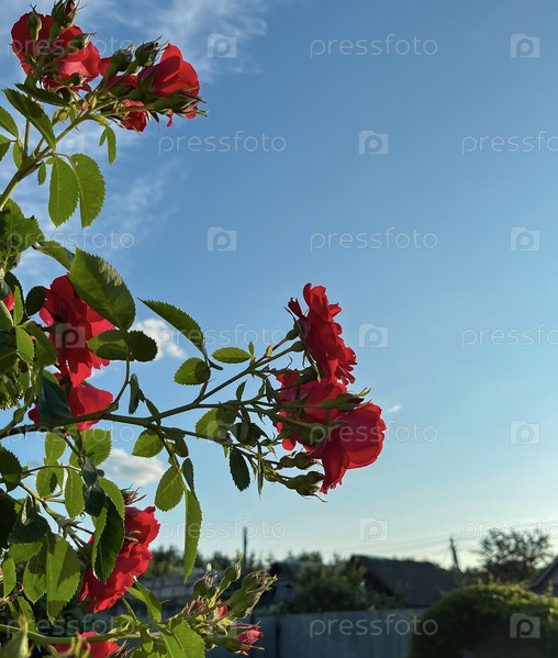 Летом в деревне цветут ярко-красные розы