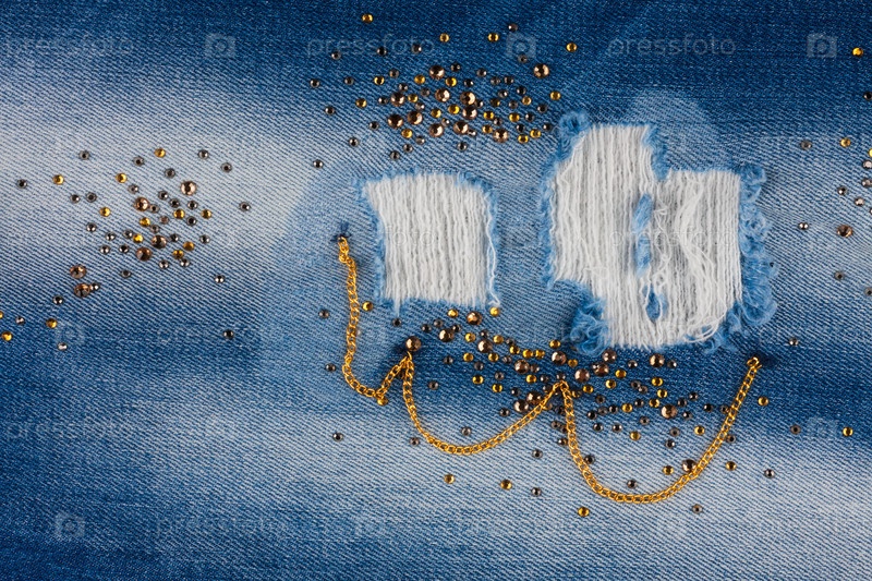 Светло-синие джинсы, разорванные стеклянными камнями и цепью