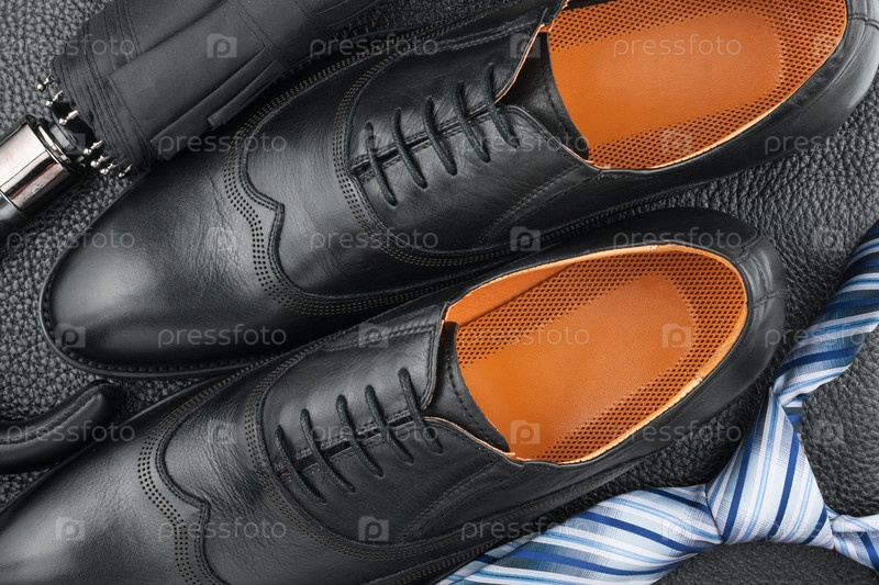 Классические мужские ботинки, галстук, зонтик на черной коже