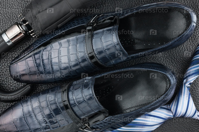 Классические синие мужские ботинки, галстук, зонтик на черной коже