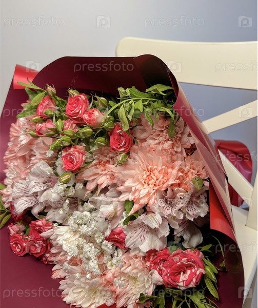 Яркий и роскошный букет кустарных роз и хризантемов в розовой упаковке