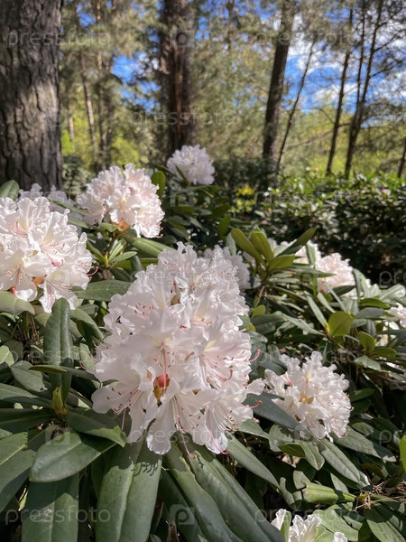 Кустарники рододендронов цветут в ботаническом саду в Минске, Беларусь