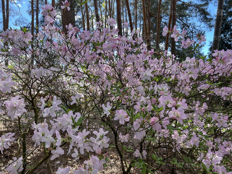 Кустарники рододендронов цветут в ботаническом саду в Минске, Беларусь