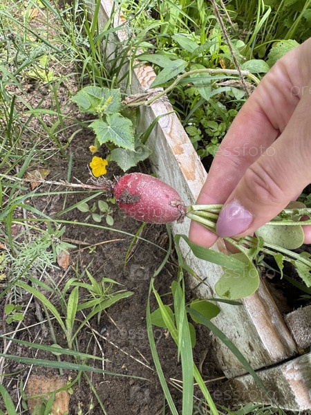 Женщина работает в саду, собирает редиску. он держит ее в руке. близко