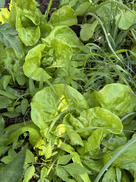 Поднятый сад с различными культурами.В саду много сорняков