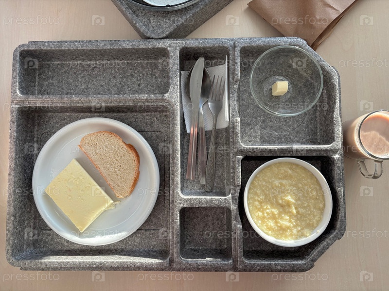 Больничная еда на больничной подносе.В ящиках разные блюда.Фото сверху