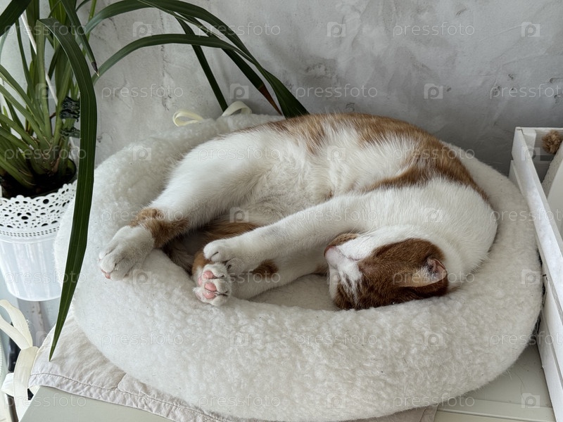 Бело-красный кот отдыхает в кошачьей кровати