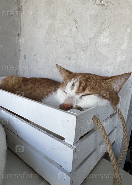 Красный с белым котом находится в деревянной коробке