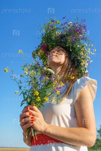 Портрет девушки в белом платье, славянского внешнего вида с букетом и венком диких цветов на голове