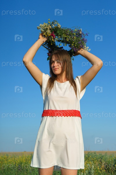 Портрет девушки в белом платье, славянского внешнего вида с венком диких цветов на голове