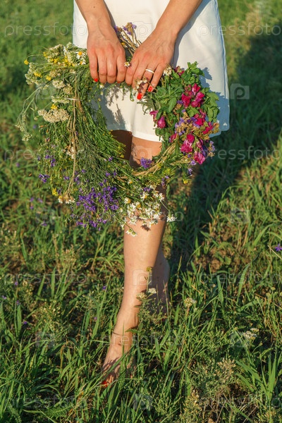 Девушка в белом платье держит венок из диких цветов и ходит босиком по зеленой траве