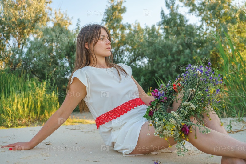 Девушка в белом платье славянского вида с венком диких цветов на голове сидит на песке