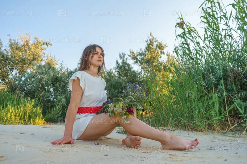 Девушка в белом платье славянского вида с венком диких цветов на голове сидит на песке