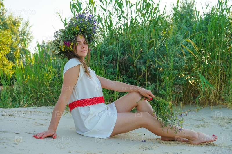Девушка в белом платье славянского вида с букетом и венком диких цветов на голове сидит на песке