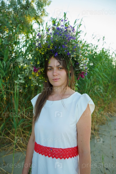 Портрет девушки в белом платье, славянского внешнего вида с букетом и венком диких цветов на голове