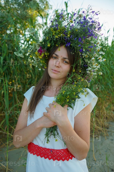 Портрет девушки в белом платье, славянского внешнего вида с букетом и венком диких цветов на голове