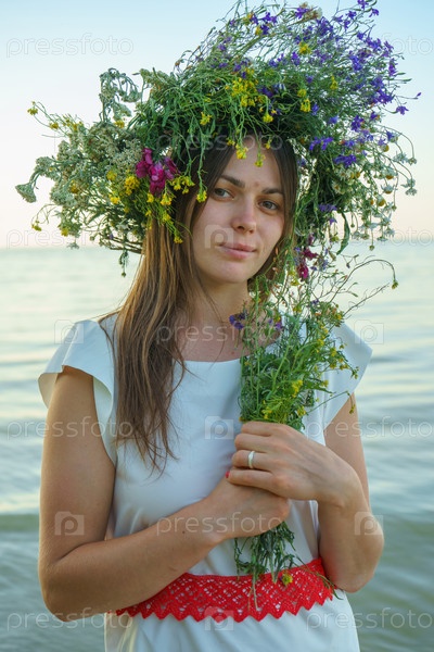 Портрет девушки в белом платье, славянского внешнего вида с букетом и венком диких цветов на голове
