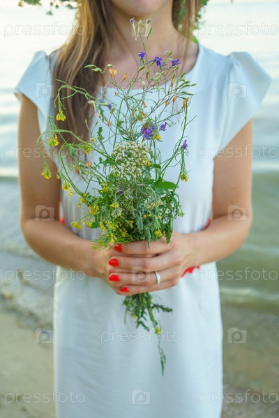 Портрет девушки в белом платье, славянского внешнего вида с букетом и венком диких цветов на голове