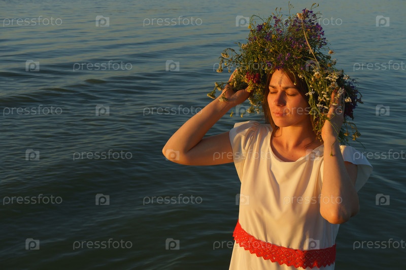 Портрет девушки в белом платье, славянского внешнего вида с венком диких цветов на голове