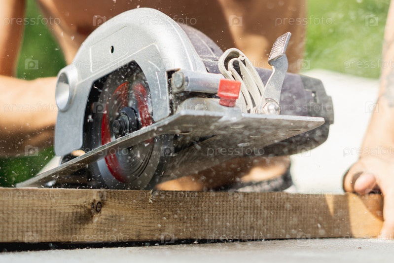 Мужчина пил дерево электрической круговой пилой