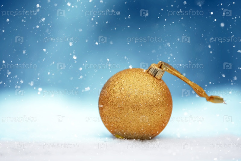 Золотой рождественский шар на голубом зимнем фоне