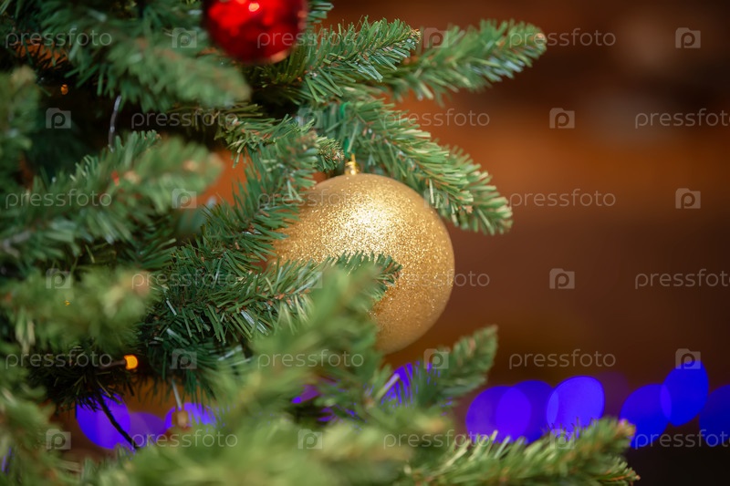На рождественской елке на фоне праздничных огней висит золотой шар