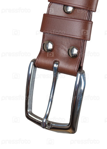Часть кожаного ремня с металлической застежкой вблизи изолирована на белом фоне