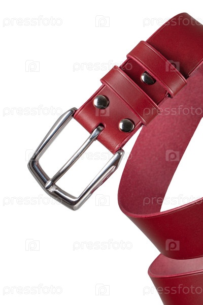 Часть кожаного ремня с металлической застежкой вблизи изолирована на белом фоне
