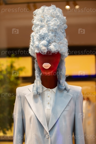 Креативный женский манекен в высоком ретро парике и выступающих тряпных губах.Смесь веков и стилей